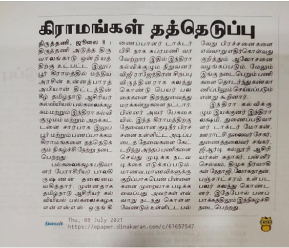 The University has adopted five villages namely Illupur, Panampakkam, Vishnuvakkam, Govindamedu and Ayathur in Thiruvallur District under Unnat Bharath Abhiyan Programme. The university served flood relief materials to affected families of villages during heavy rain.
