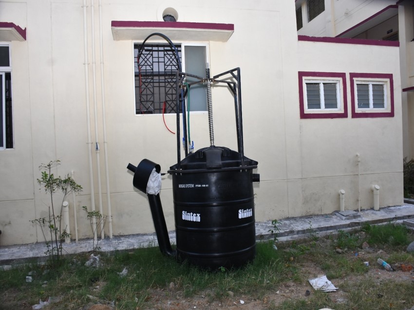 It is in the canteen to produce biogas from the food and vegetable wastage which is being used for cooking.