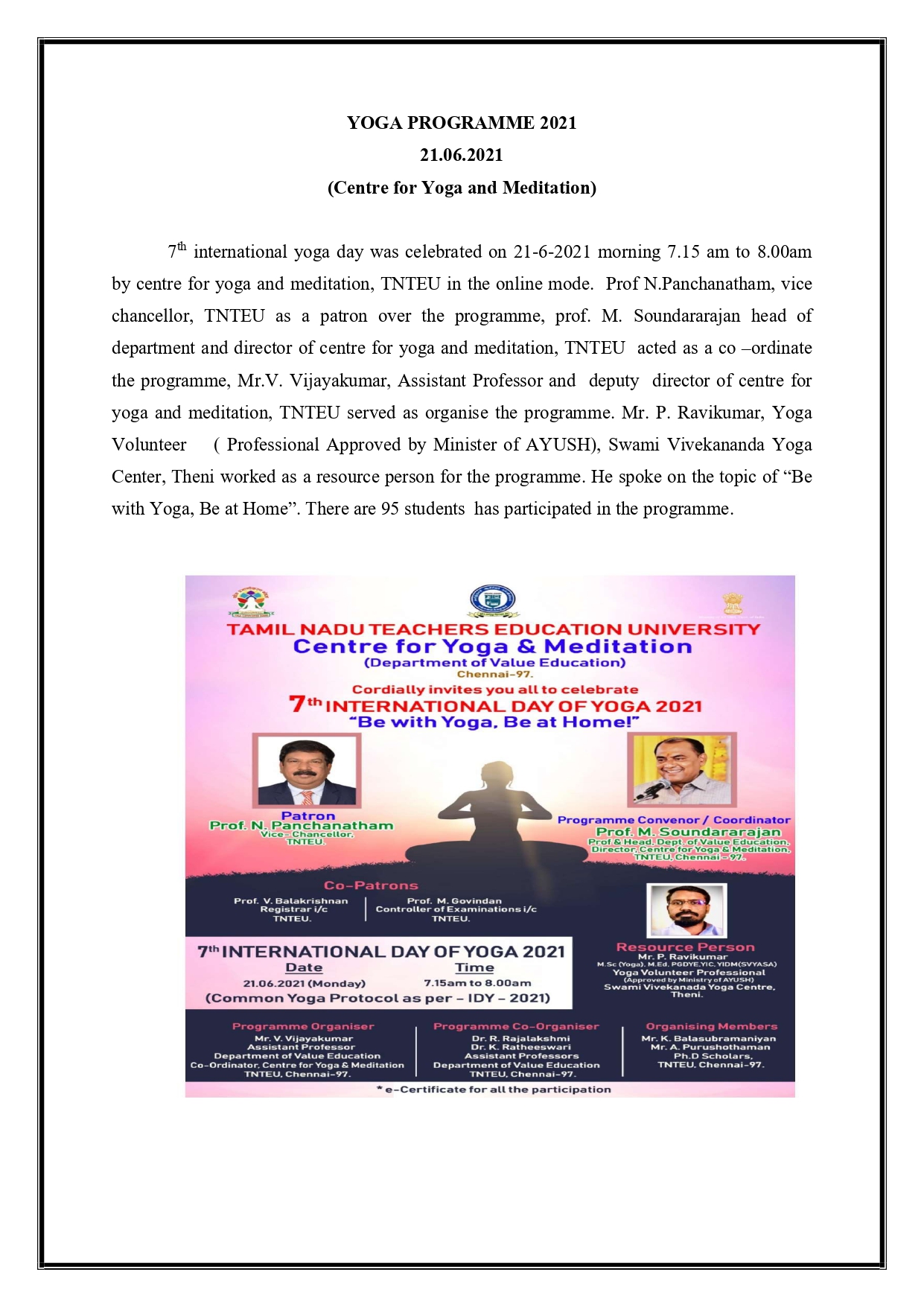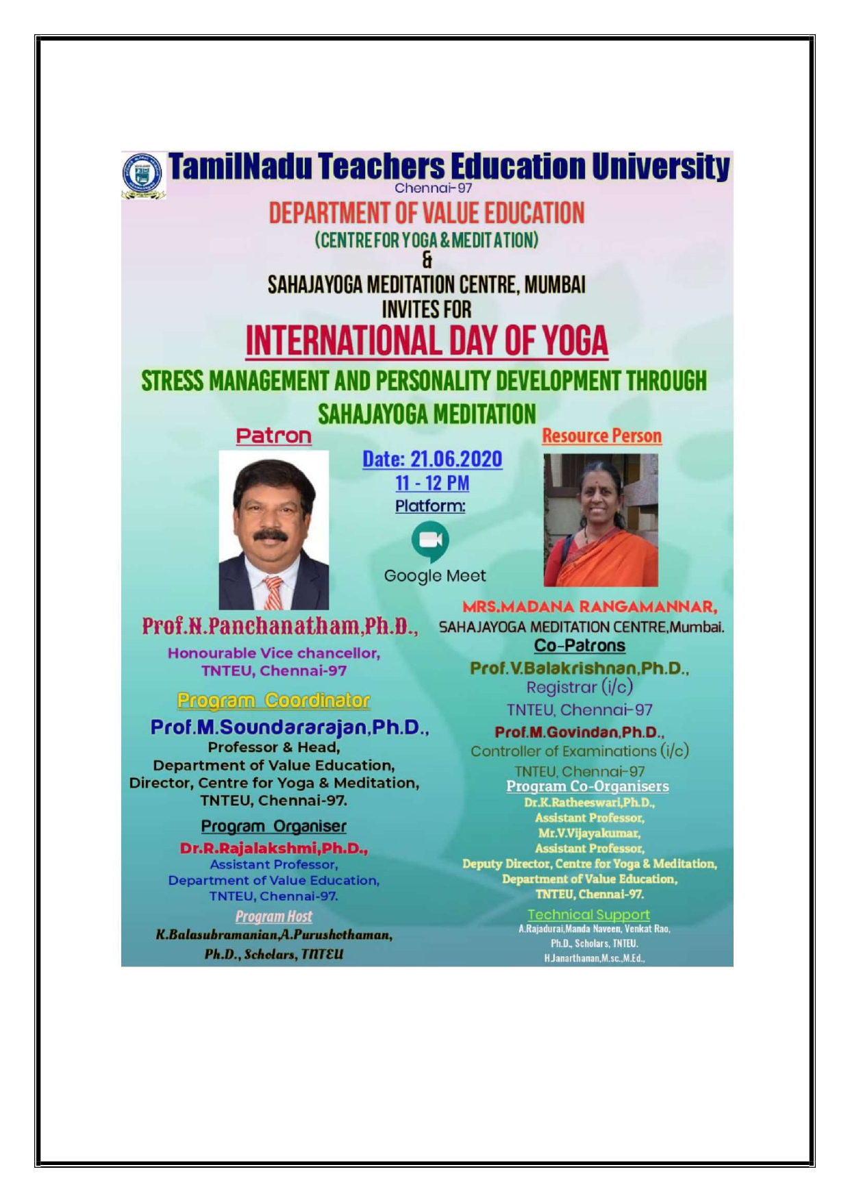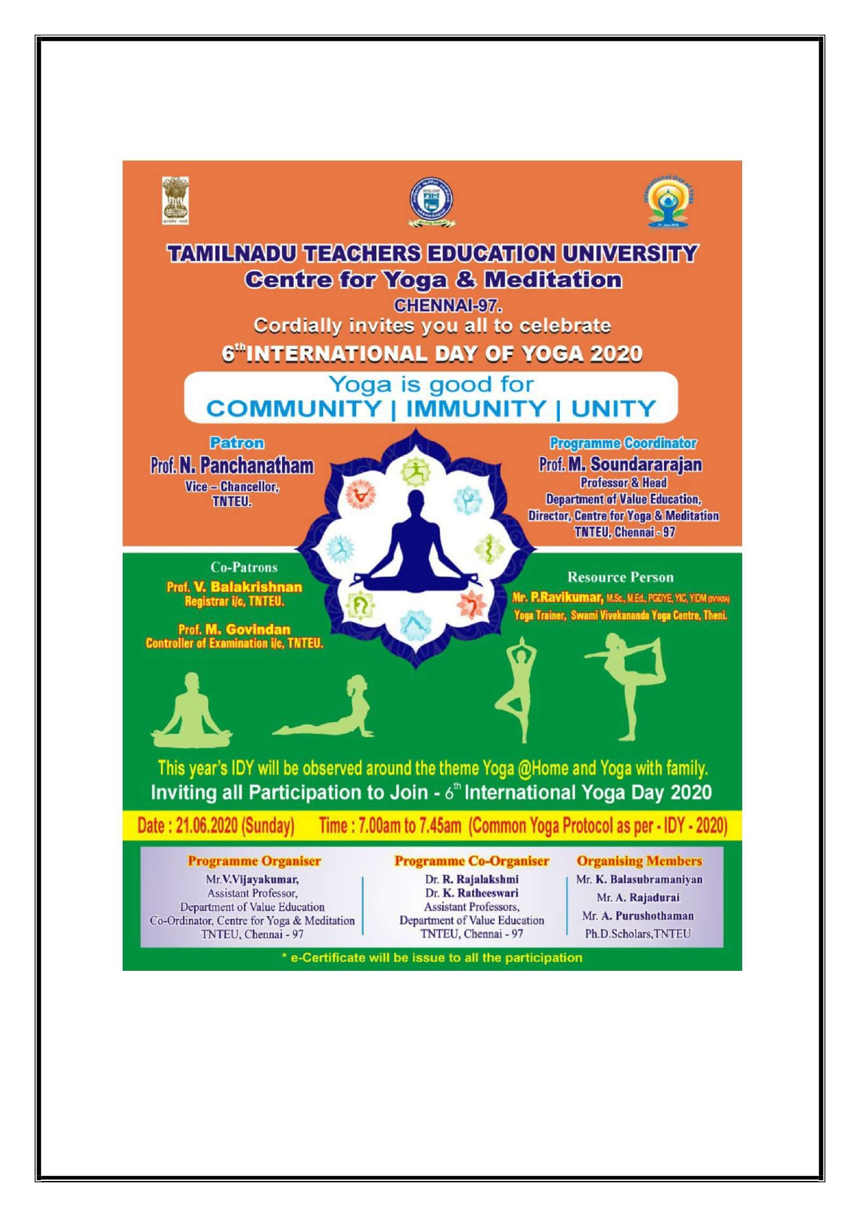 The Center for Yoga and Meditation of TNTEU has been functioning well by organising various Programmes related to Yoga and Meditation activities in collaboration with other institution and agencies at Government and Non-Government level by mobilization the resources each other mutually. The process of signing MoU’s at regional, national and international entities is underway.